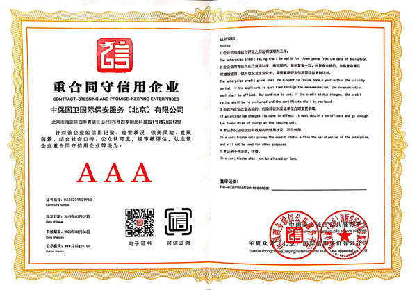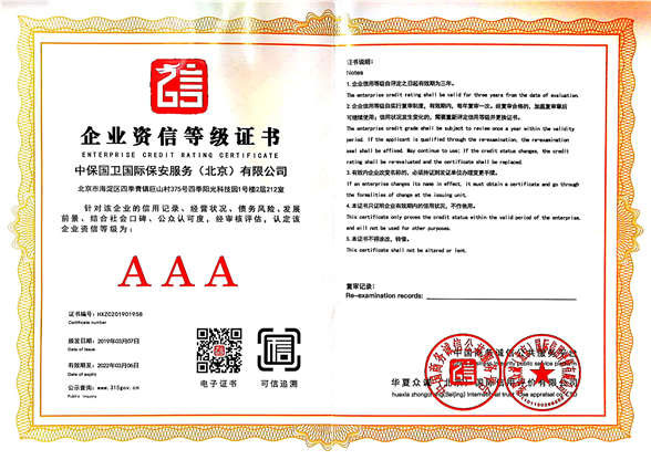 中保國衛(wèi)國際保安服務(wù)(北京)有限公司,屬中保國衛(wèi)集團旗下子公司。能全方位的為大型客戶提供優(yōu)質(zhì)的安保、押運服務(wù),是集人防和技防于一體的新型正規(guī)化綜合安保押運服務(wù)企業(yè),提供人防、物防、技防、聯(lián)網(wǎng)報*、非武裝押運等安防相關(guān)的一站式服務(wù)。 公司在國內(nèi)多省設(shè)立有分公司及分支機構(gòu),著重提升安全押運、智能技術(shù)押運及安全技術(shù)防范相關(guān)的服務(wù),業(yè)務(wù)范圍覆蓋全國一、二線城市、港澳地區(qū)以及海外地區(qū)。安保方面主要為政府機構(gòu)、金融機構(gòu)、企事業(yè)單位、醫(yī)療衛(wèi)生、高等院校、工業(yè)園區(qū)、大型商場、高檔住宅、智能商務(wù)樓、大型活動提供門衛(wèi)、守護、巡邏、押運(非武裝)、安全檢查、保安特勤、私人護衛(wèi)、消防中控、安全技術(shù)防范、遠洋護航等全方位服務(wù),同時面向國際市場,為中資企業(yè)在“一帶一路”沿線國家投資提供境外安保服務(wù)。 >> 更多內(nèi)容 |